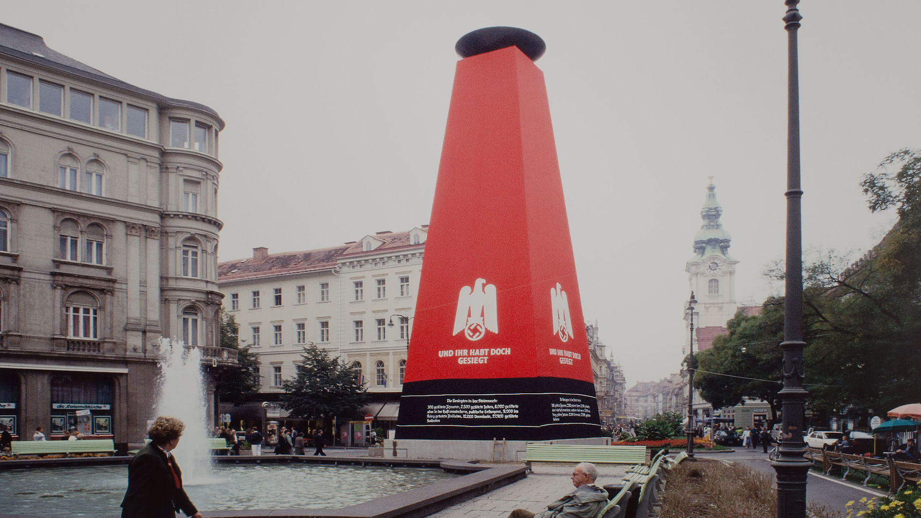 The (missing) reappraisal of the National Socialist past in Austria was also criticized by artists from the 1980s at the latest. As part of the steirischer herbst festival 1988, initialized by the art historian Werner Fenz, the artist Hans Haacke created a reconstruction of the obelisk with which the National Socialists had encased the Marian column at Eisernes Tor in 1938. At that time, the victory symbol was intended as an acknowledgement for the “City of the Popular Uprising”. With his memorial, Haacke drew attention to the crimes of the Nazi era. Right-wing extremists set it on fire. The general public responded immediately with protests in front of the burnt down obelisk.
