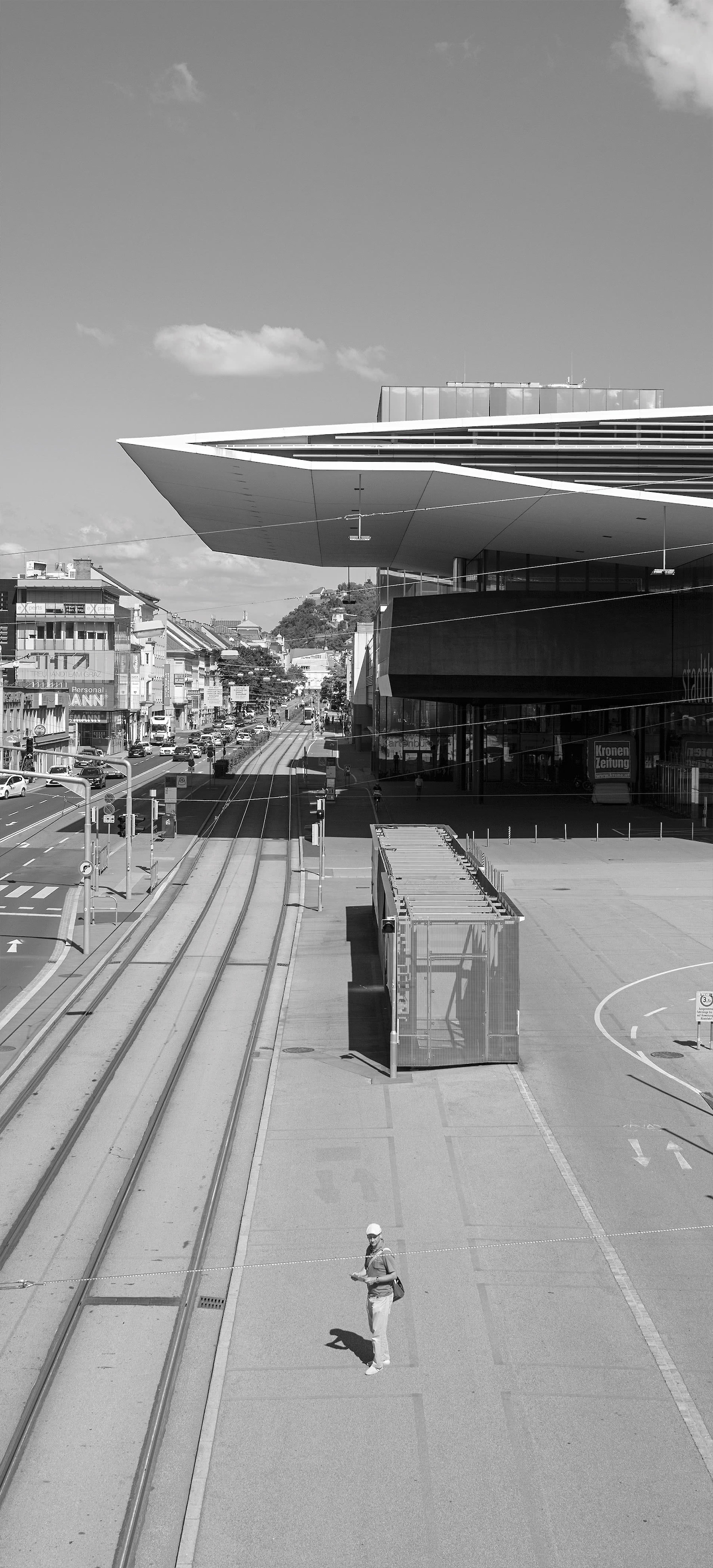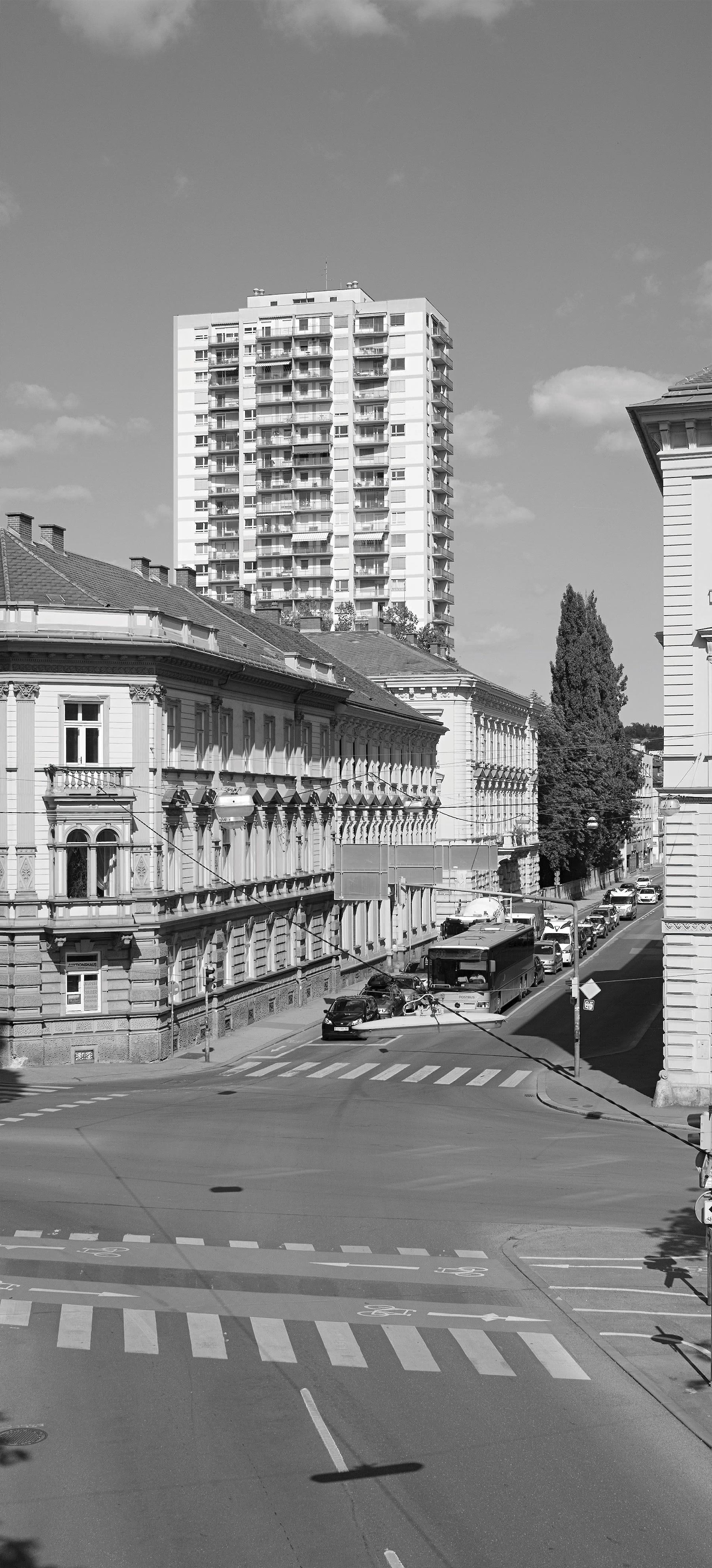 The pale light of the light tower on Andreas-Hofer-Platz illuminates an infrastructure for motor traffic which filled a gap site in 1966. Until 1934, the Monastery of the Order of the Sisters of the Blessed Virgin Mary of Mount Carmel had been there, on Fischplatz, which had been dissolved by Joseph II and had become the “k.u.k. Monturdepot” (Imperial and Royal Uniform Depot). The underground car park, the pavilion of the rent-a-car, and the light tower tell of an era in which a lot was to be sacrificed to motorisation. Among other things, the bicycle demonstrations led by Erich Edegger and the establishment of “Alternative Liste Graz” responded to the “car-friendly city” around 1980.