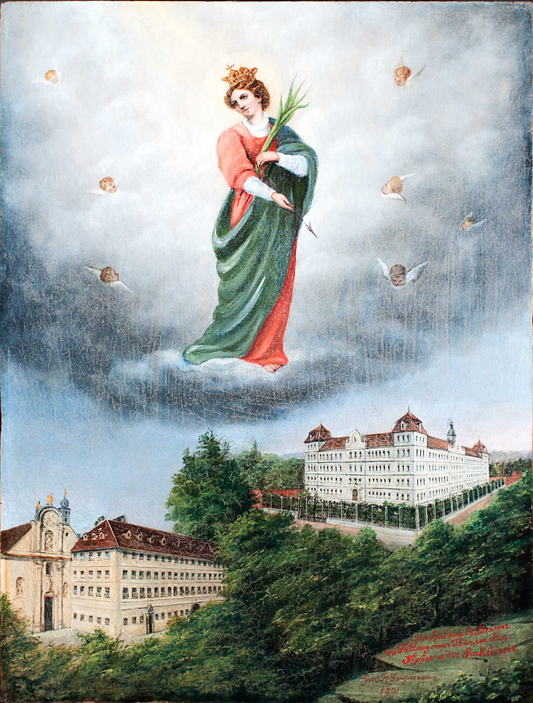 In the course of Counter-Reformation, many orders settled down in Graz too. The imperial house, which aimed for a systematic recatholicisation of Styria, was the driving force behind this. School education for girls was the main aim of the Ursuline Order, which was founded in 1535. The monastery, which was erected in the Sackstraße between 1696 and 1722, was dismantled in 1900 except for the church. In the very same year, the order moved into a new building in the Leonhardstraße, which had been conceived by Josef Schmalzhofer. The painting was created on this occasion.