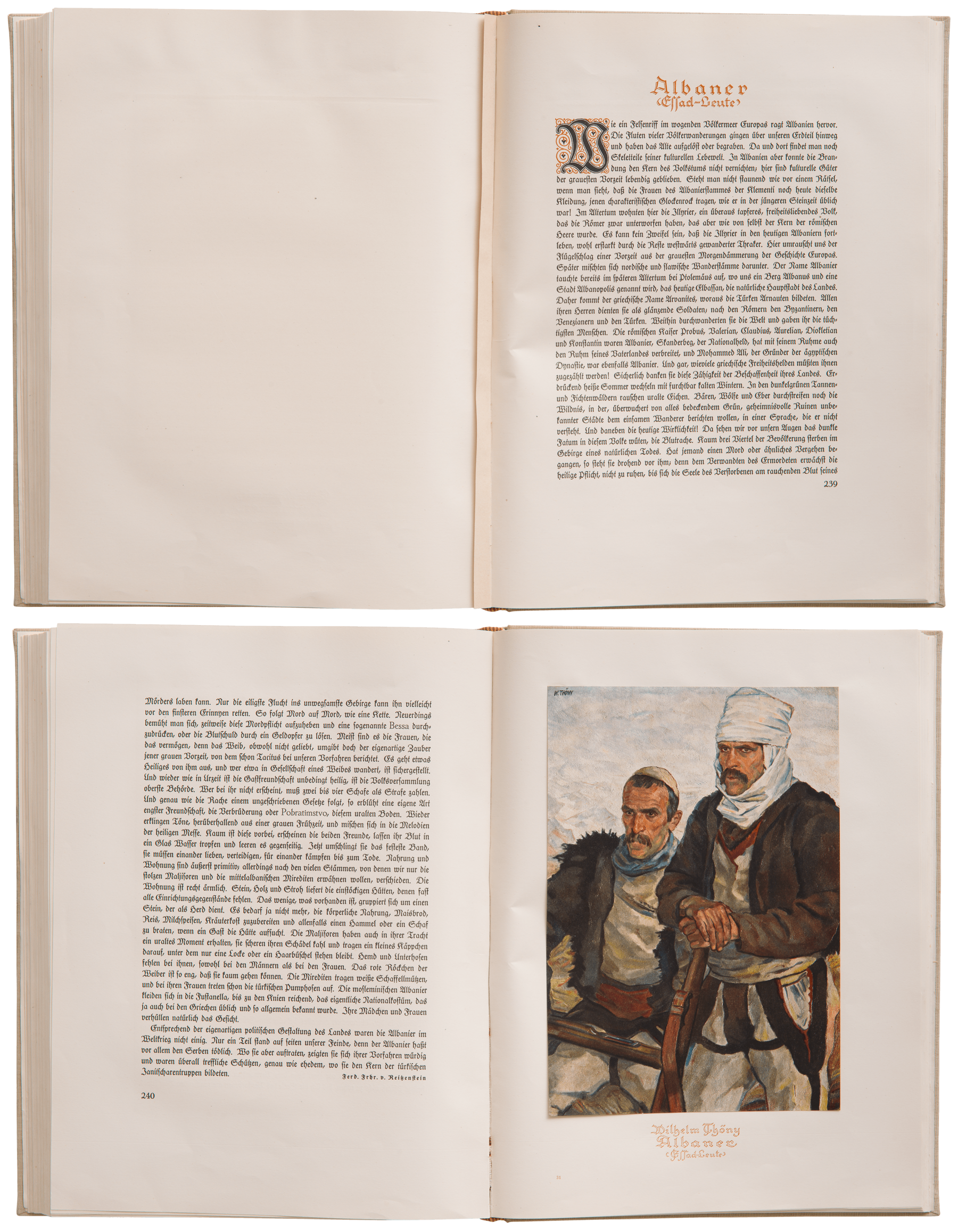 Wilhelm Thöny created seven original paintings for “Die Feinde Deutschlands und seiner Verbündeten“: “Italienische Bersaglieri“ (Italian Bersaglieri), “Italienische Alpenjäger“ (Italian Alpino), “Albaner“ (Albanian), “Serben Infanterie“ (Serbian Infantry), “Serbische Zigeuner“ (Serbian Gypsies), „Rumänen“ (Romanians) and „Grieche“ (Greek). For these individual and group portraits, he worked in prisoner-of-war camps, where he could select the portrayed persons and have them photographed. This propaganda work served to legitimize war and was intended to underline the strength of the German soldiers as a closed unit. Already purely visually, the enemies in the war were depicted as heterogeneous foreign types. Thöny’s portraits of the “enemy” also exhibit hardened, malicious eyes. As a counterpart to this portfolio work, “Die Wehrmacht Deutschlands und seiner Verbündeten“ (The Armed Forces of Germany and its Allies) was published.