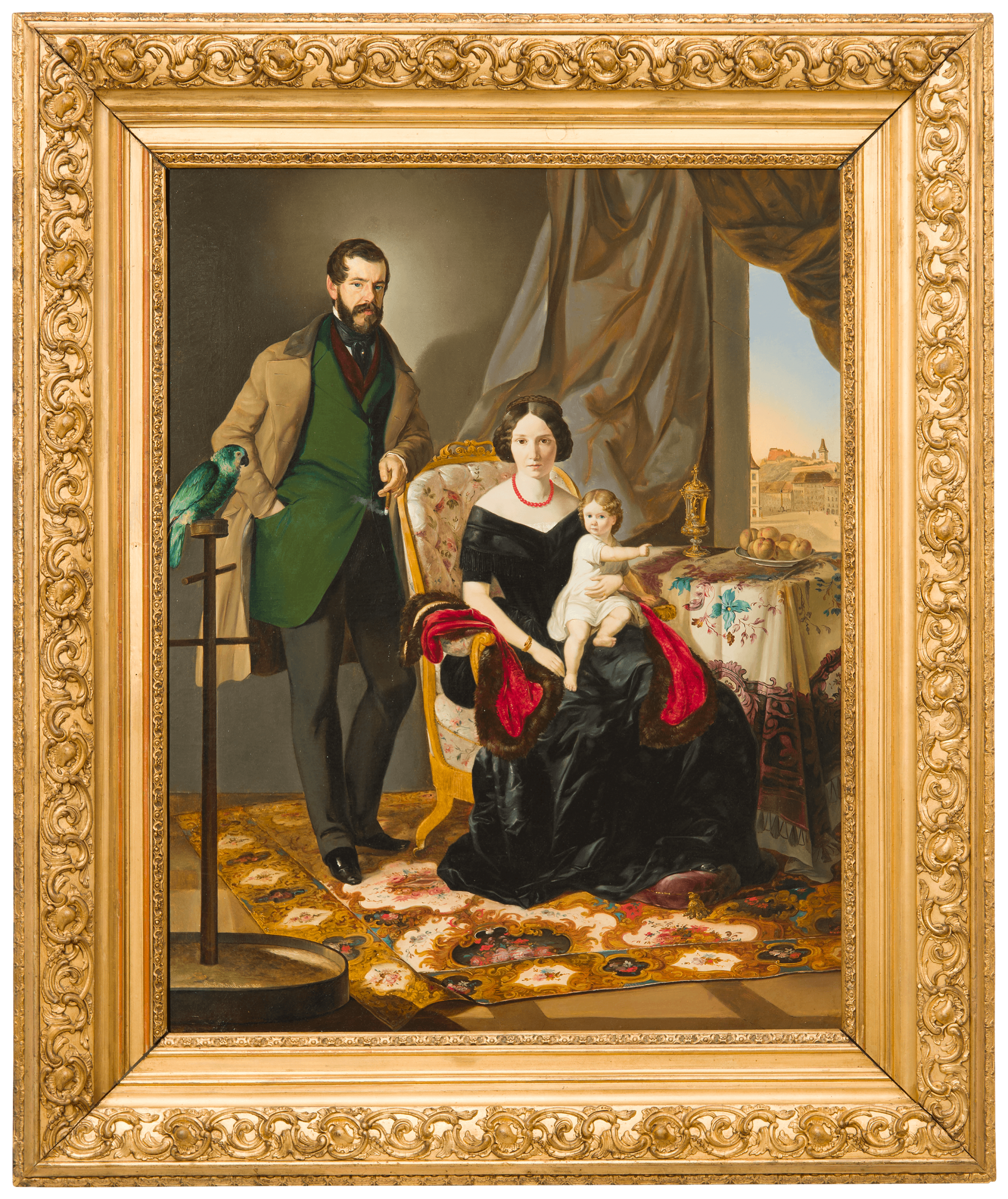 The Rochel family belonged to the old-established merchant families in Graz. In their formation, they remind of representations of the Holy Family: Mother and child resemble Mary and Jesus. The man is standing behind them as the patriarch. The golden receptacle on the table, the carpet and the exotic parrot reflect the family’s wealth and refer to its trade relations with distant countries. The jewellery, their clothes and the red curtain too imitate the self-expression of the nobility.