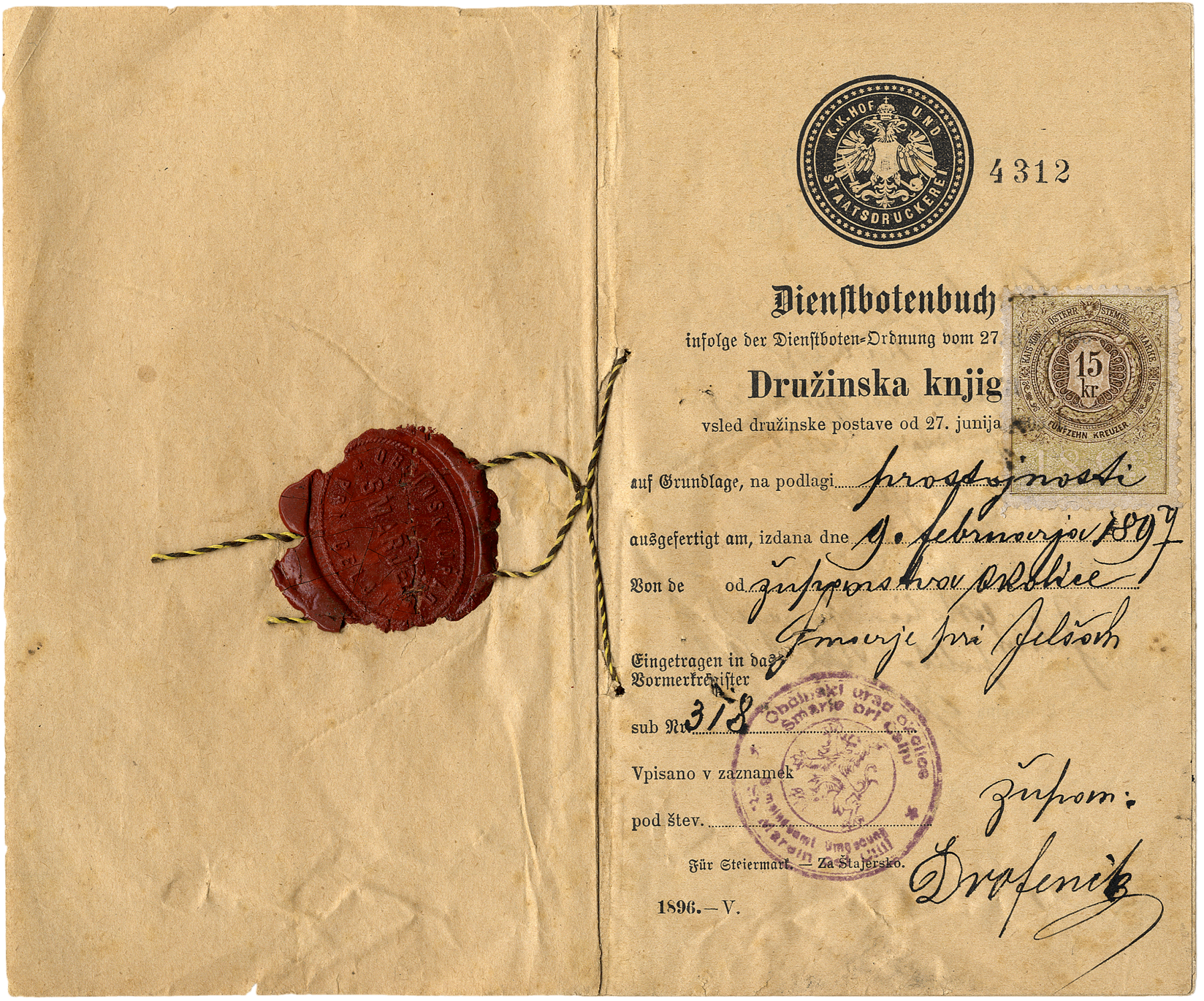 Servants’ Book of Cecilija Kolar in Slovene and German issued by her Hometown of St. Marein bei Erlachstein / Šmarje pri Jelšah, 1898