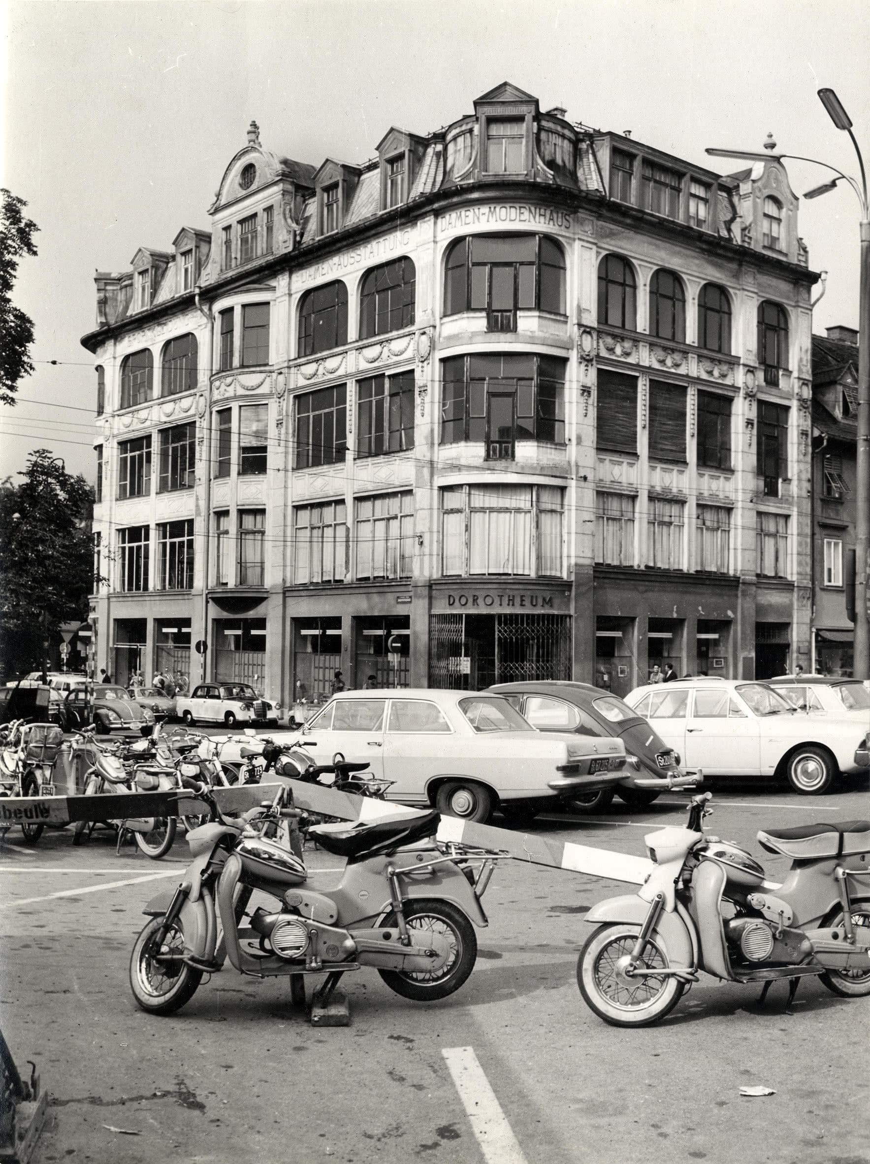 In the second half of the 20th century, many historical and protected buildings in Graz disappeared from the cityscape. The “Englische Haus“ (English House) on Jakominiplatz—a department store which had been erected as a modern skeleton structure in 1908—was converted into the auction house Dorotheum in 1969/70 after plans by Anton Potyka and Franz Comsi. The adjacent inn “Zur Stadt Triest” from 1790, which had been converted into the “Steirerhof” hotel around 1900, was finally replaced by a shopping centre planned by Adolf Krischanitz in 1993. The “Kommod House” opposite to Tummelplatz, which was built in 1785, was named like this only since its demolition in 2003, after the trendy pub that it had hosted. On its premises, an office and residential complex, which has been designed by Zaha Hadid, has been built.