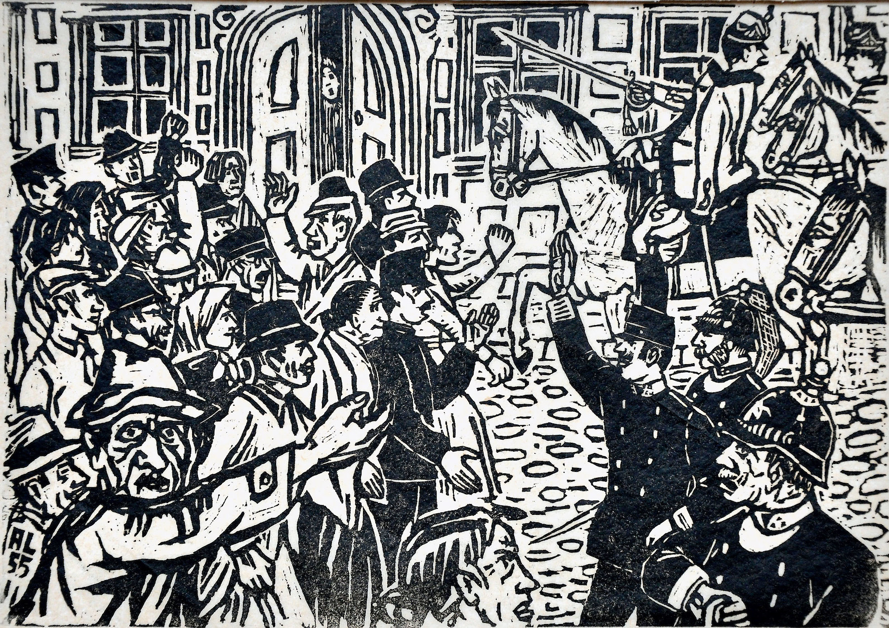 The technique of woodblock printing was very widespread in the interwar period and was regarded as the medium of “leftist” artists. Woodblock printing enabled a large number of copies to be reproduced and distributed and was thus perceived as a democratic medium. But also, the dynamic, expressive formal language supported by this technique was largely associated with politically leftist, revolutionary content.