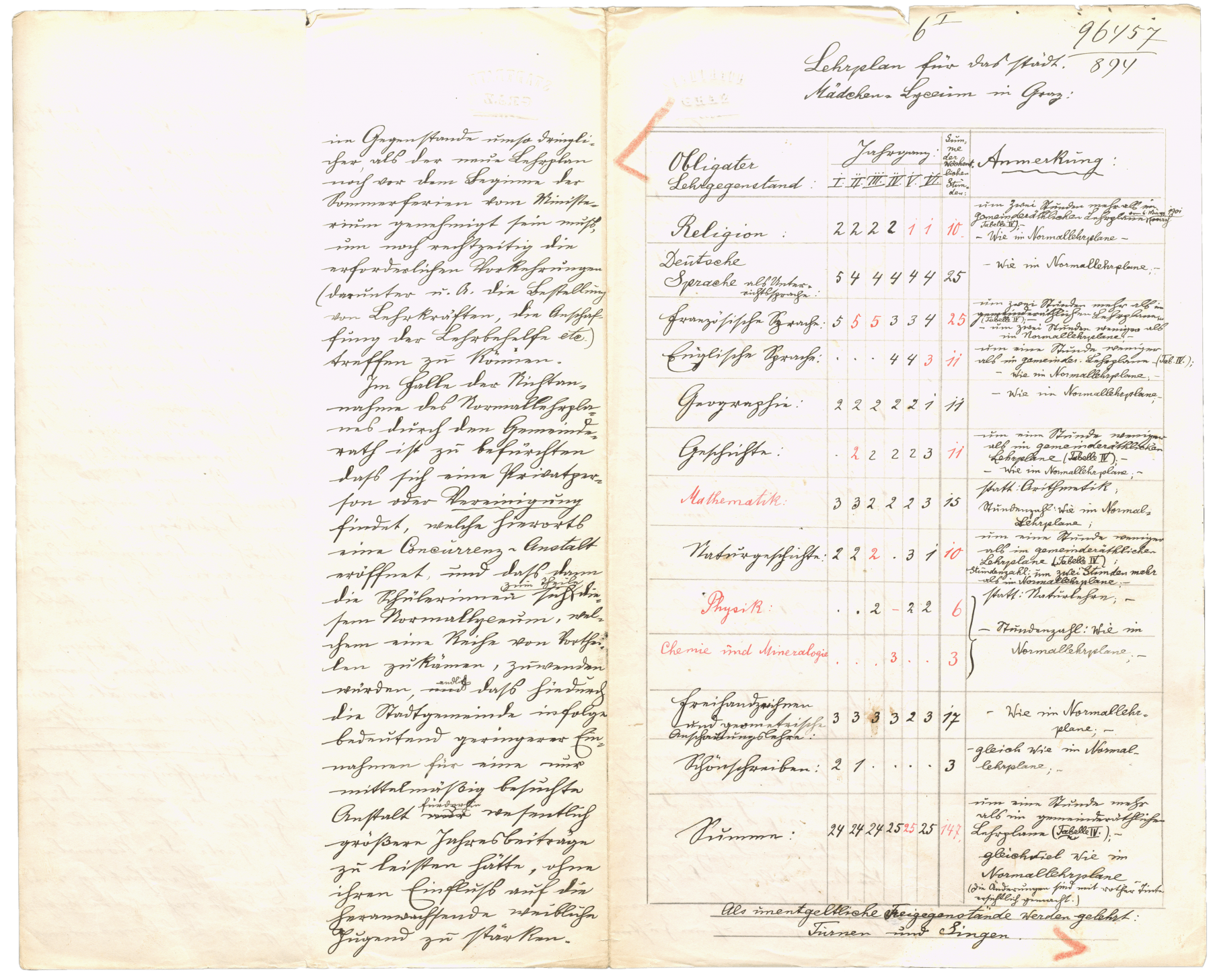 In 1873, the sexennial girls’ lyceum became the first of its kind within the Danube Monarchy to start its work. In the curriculum, emphasis was deliberately placed on a humanistic education. Nevertheless, the lyceum provided an occasion for public discussion, and acceptance of the training for university studies remained difficult. It was not until 1897 that women graduates were allowed to study at universities as non-degree students, and in 1912 the school was given the same status as boys’ grammar schools. Between 1876 and 1938, the school was housed in Sackstraße 18, the building of today’s GrazMuseum.