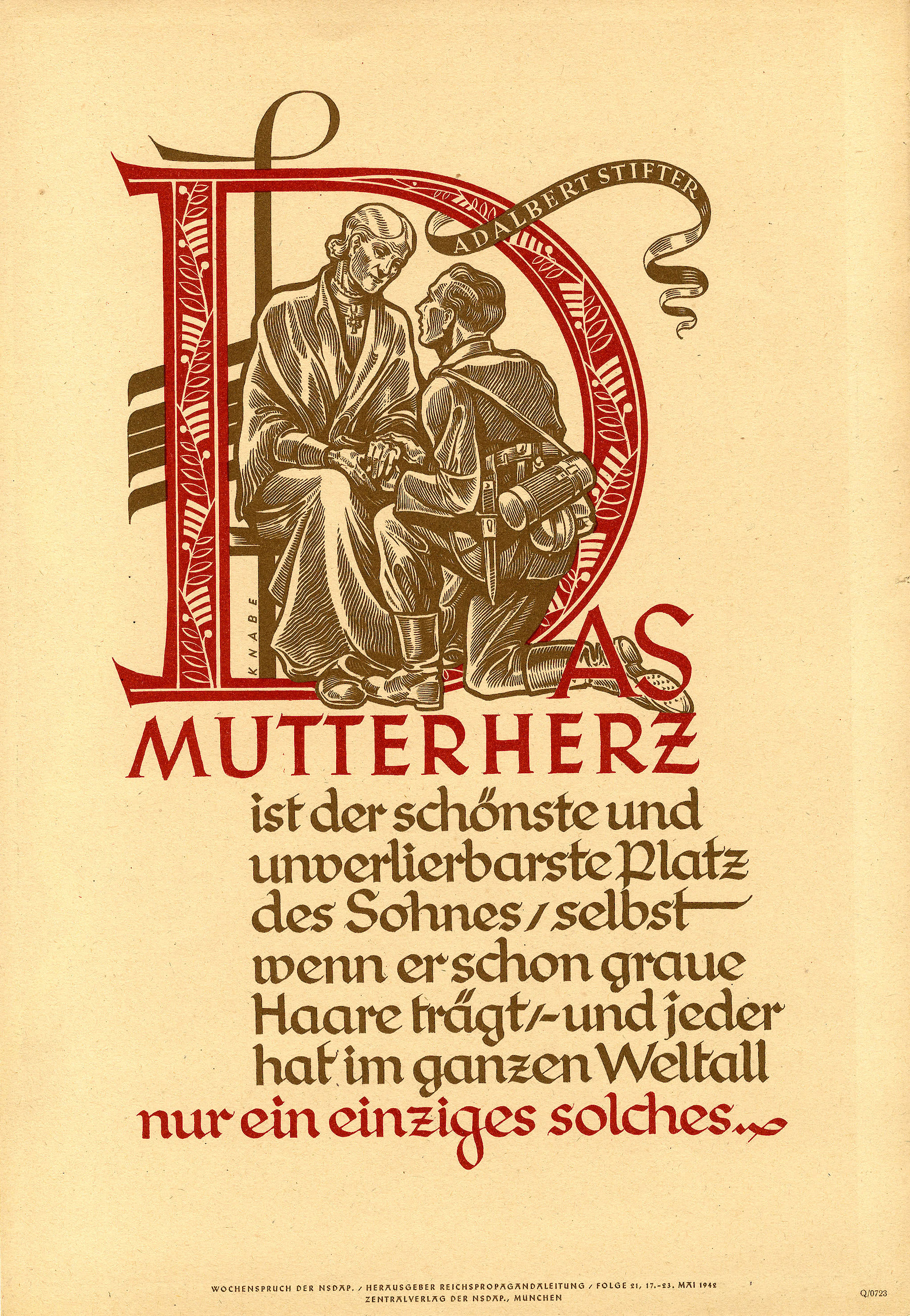 National Socialism ousted women from public life and reduced them to their role of mothers, which revoked the beginnings of emancipation in the time of the First Republic. Its policy of expansion motivated by racial hostility, above all towards living space in the east, increased the pressure. The Mother’s Cross, which was conferred to “Aryan women” with four or more children, combines the symbolism of the war decoration of the Iron Cross with the colour of the cult of the Virgin Mary.