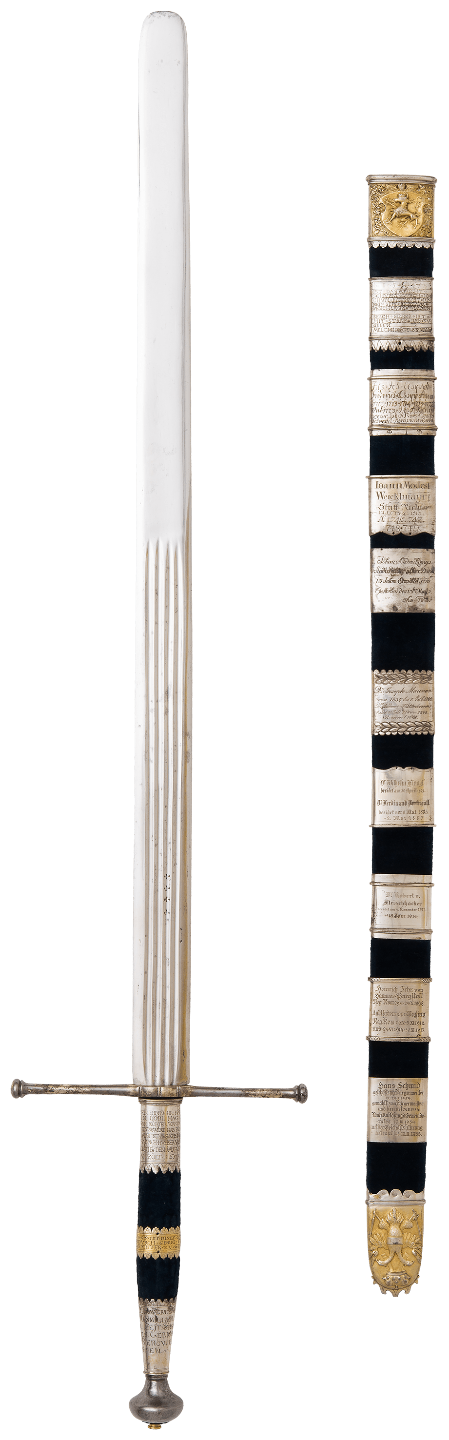Im frühen Mittelalter lenkte zunächst ein Stadtrichter die Verwaltung der Stadt. Als Zeichen seiner Würde und der Rechtsprechung trug er dieses Schwert, dessen Griff und Scheide mit blauem Samt überzogen sind. Auf der mit 14 Silberspangen umfangenen Scheide sind die Namen und Amtszeiten der Grazer Stadtrichter und Bürgermeister eingraviert. Das Amt des Bürgermeisters wurde erst im 15. Jahrhundert eingeführt, als die Verwaltung mit der Größe der Stadt immer umfangreicher wurde. Gemeinsam mit Richter und Rat bildete er die Stadtobrigkeit.