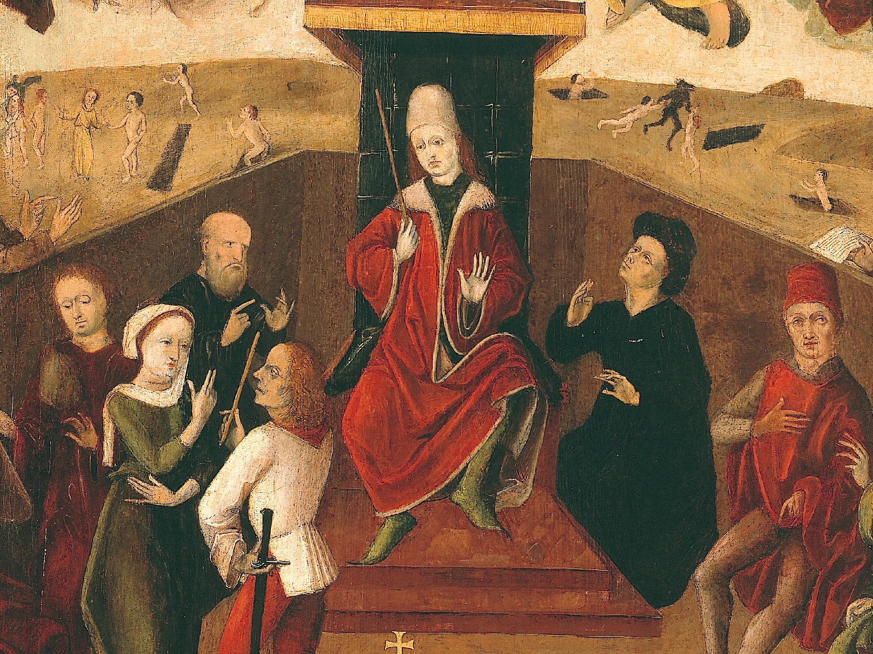 Über dem Stadtgericht tagt das Himmlische Gericht. Im Zentrum steht Christus als Weltenrichter („Majestas Domini“), angelehnt an Tympana-Darstellungen mittelalterlicher Kathedralen. Mit Maria und Johannes dem Täufer, den Fürsprecher*innen der Menschheit, bildet Christus eine Dreieckskomposition („Deesis“). Symmetrisch flankieren ihn die 12 Apostel. Engel blasen in die Posaunen und erwecken damit die Toten zum Leben. Im Mittelalter waren Weltgerichtsdarstellungen allgegenwärtige Hinweise auf die Wiederkunft Christi auf Erden: dem Jüngsten Tag, an dem alle Menschen Rechenschaft vor Gott ablegen müssen und zu himmlischer Erlösung oder ewiger Verdammnis verurteilt werden.