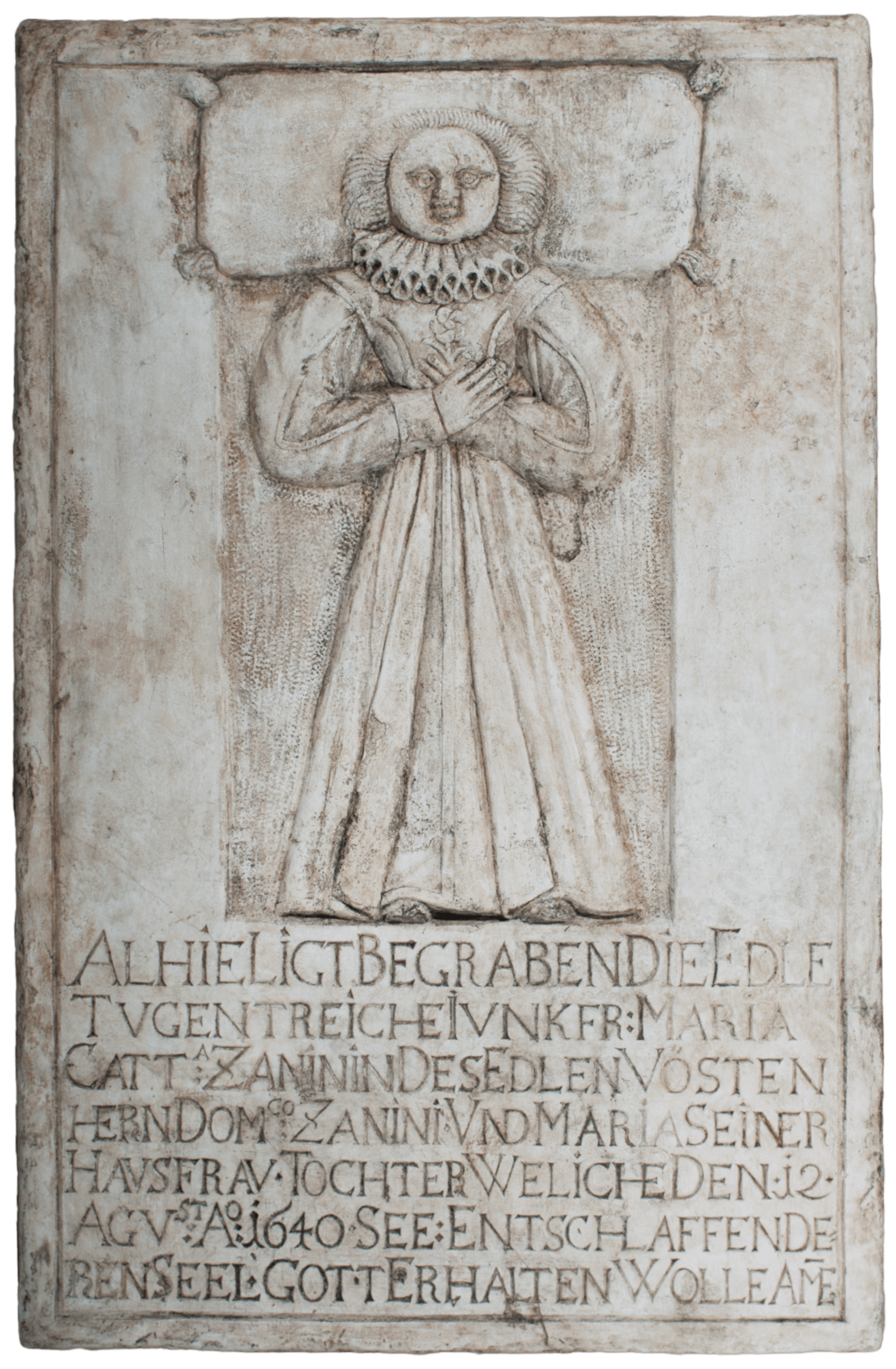 Dieser Grabstein von Maria Catterina Zanini befindet sich im Kreuzgang des Grazer Franziskanerklosters. Im Zuge der Gegenreformation forcierte der Grazer Hof die Einwanderung von Menschen aus dem katholisch-romanischen Teil Innerösterreichs. Adelige, Hofbeamte, Bauleute, Kunstschaffende und Kaufleute wie die Familie Zanini brachten neben einer streng katholischen Gesinnung auch südliche Bräuche und die Renaissance als Kunststil nach Graz. Anfang des 18. Jahrhunderts errichteten sie sich ein eigenes Gotteshaus, die „Welsche Kirche“ am Griesplatz.