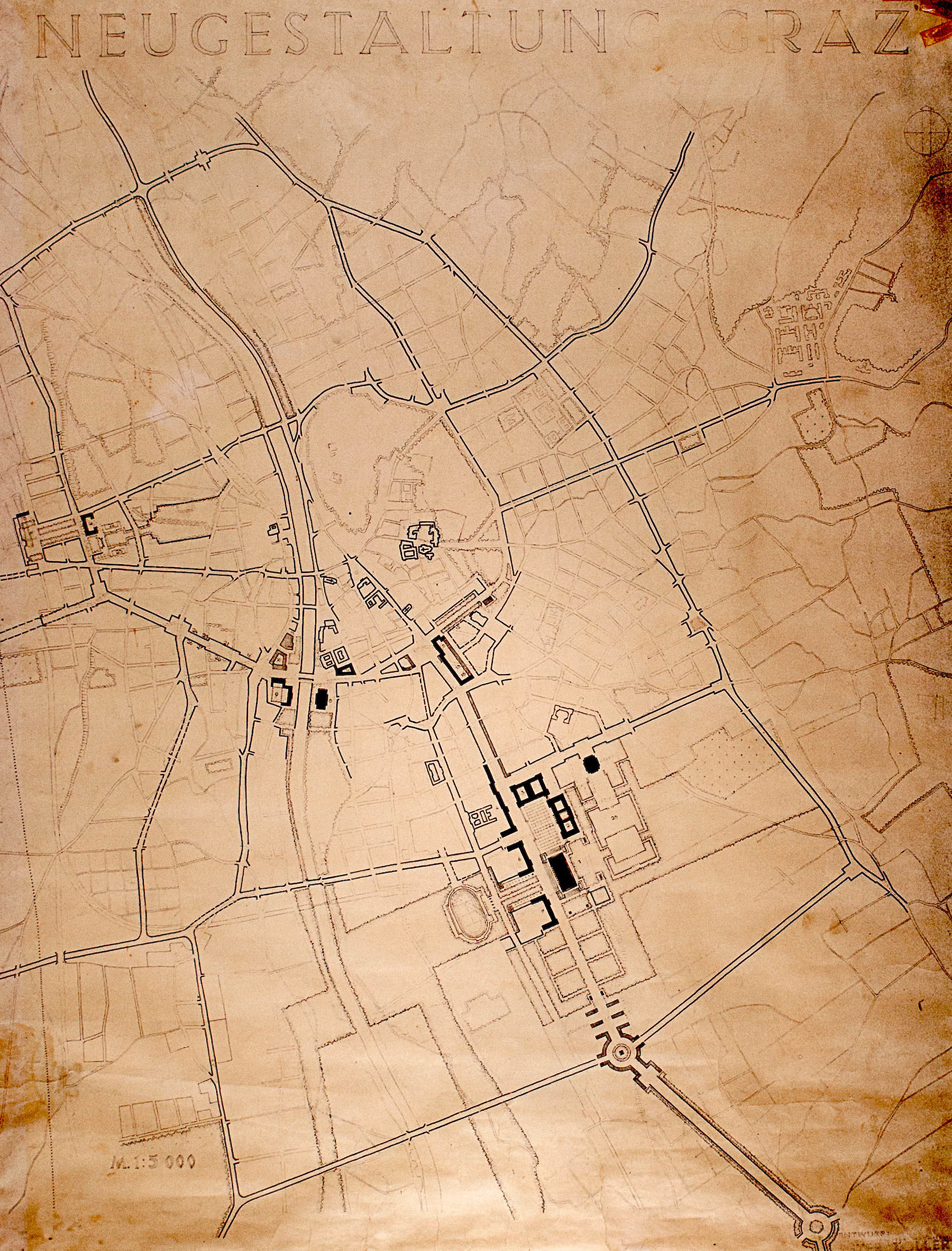 Plan der Hauptstraßen der inneren Stadtgebiete und Lage der neuen Verwaltungsgebäude Peter Koller, Berlin, 1939–1940
